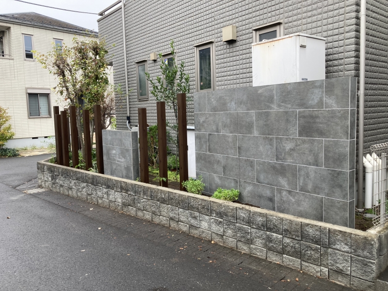 道路に面する植木を全面撤去し、枕木材とタイル門塀でパーテーションを作成いたしました。