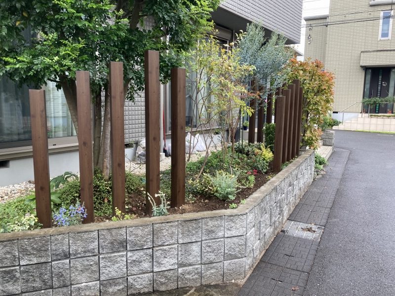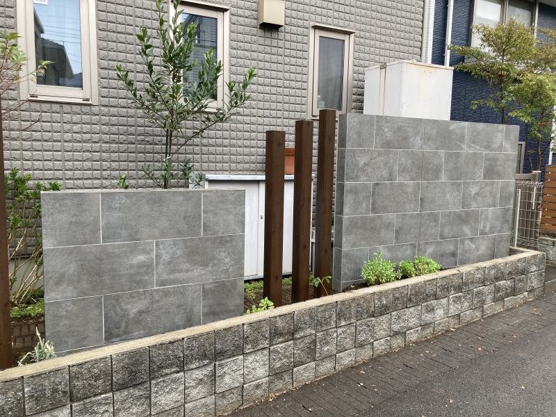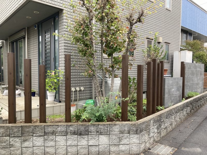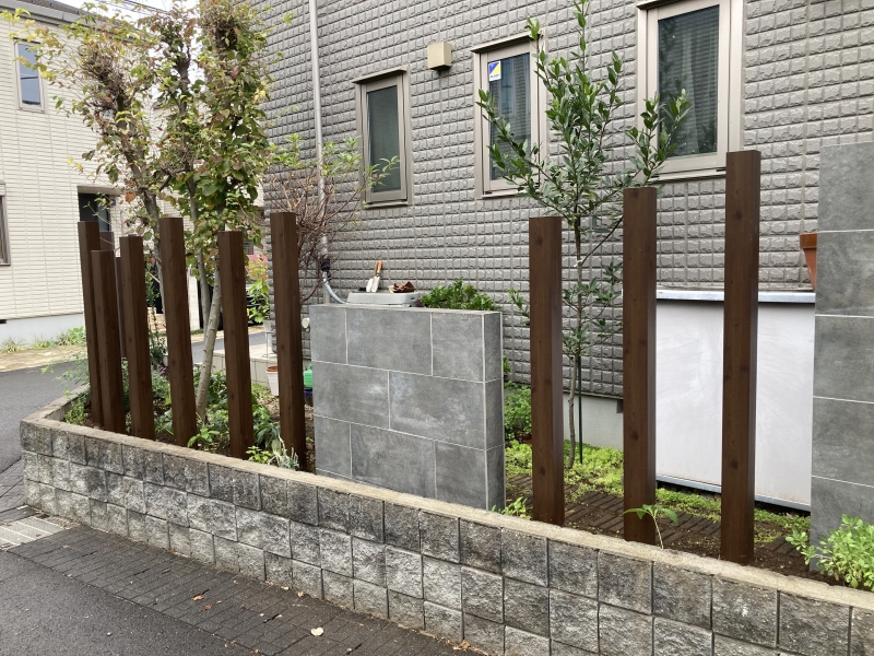 道路に面する植木を全面撤去し、枕木材とタイル門塀でパーテーションを作成いたしました。 高木などど雰囲気がとても合っていて素敵に仕上がっています。