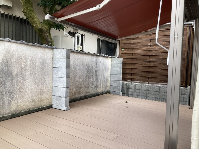 オーニングとウッドデッキのセットでの工事でした。 オーニングもを取り付ける事で日差しを遮ってくれて、ウッドデッキでくつろげるスペースを確保しています。 不要になれば畳むことが出来とても便利な商品です。