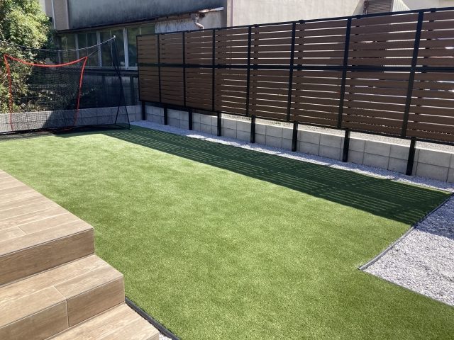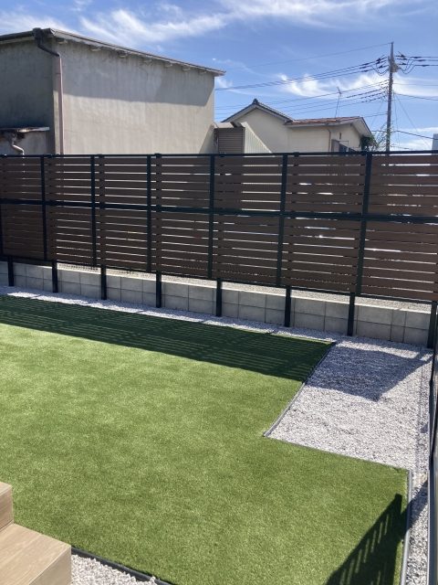 隣地側からの目線を遮る、高さのある目隠しフェンスの設置と、 お庭で遊べる人工芝の施工です。 目線を気にせずくつろげるスペースが出来ました。